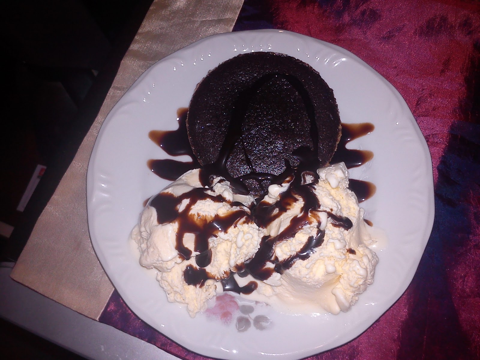 Decore o prato com calda de chocolate e duas bolas de sorvete de creme Nestlé, coloque o petit gateau já asssado e regue mais calda. Sirva a seguir.